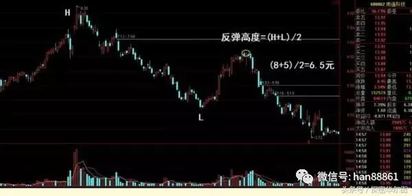 根据多年的操盘经验得知:市场在每下跌一波后,其后反弹的高度一般为下跌高度的1/3、1/2、2/3位,具体会根据大盘温度的不同而不同。在此,不取最高值,也不取最低值,取中间值,把下跌初期的高点用H代表,把下跌末期的低点用L代表,换算成公式的话,则反弹高度=(H+L)/2。