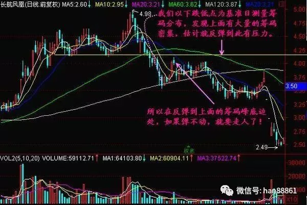当市场下跌至最近的筹码峰时,就有可能发生反弹。此时,市场会反弹至上方的第一个筹码峰。而当市场反弹至筹码峰时,能量就很容易被消耗掉。如果市场继续拉升,筹码峰里的套牢盘就会解套,因此市场继续拉升就会很乏力。