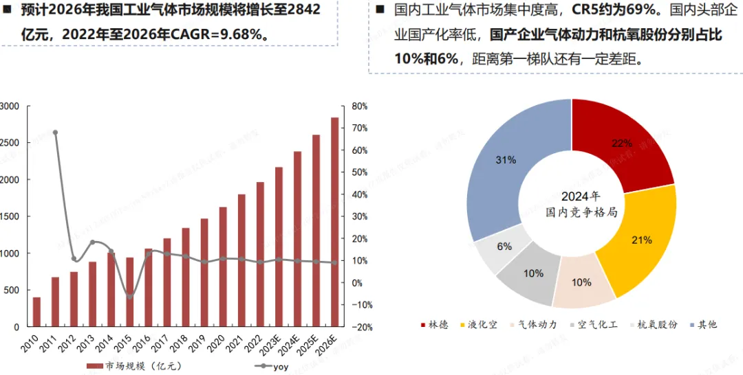 全球电子气体由林德、液化空气等外资寡头垄断,国内电子特气国产化率仅25%、电子大宗气体国产化率偏低,自主可控需求迫切。2026年商务部对日产二氯二氢硅发起反倾销调查,叠加两用物项管制,倒逼下游晶圆厂加速导入本土供应商。电子气体行业认证壁垒高,一旦导入客户供应链可实现15年以上长期绑定,存量市场替换+新增市场抢占双轮驱动,本土企业市占率持续提升。