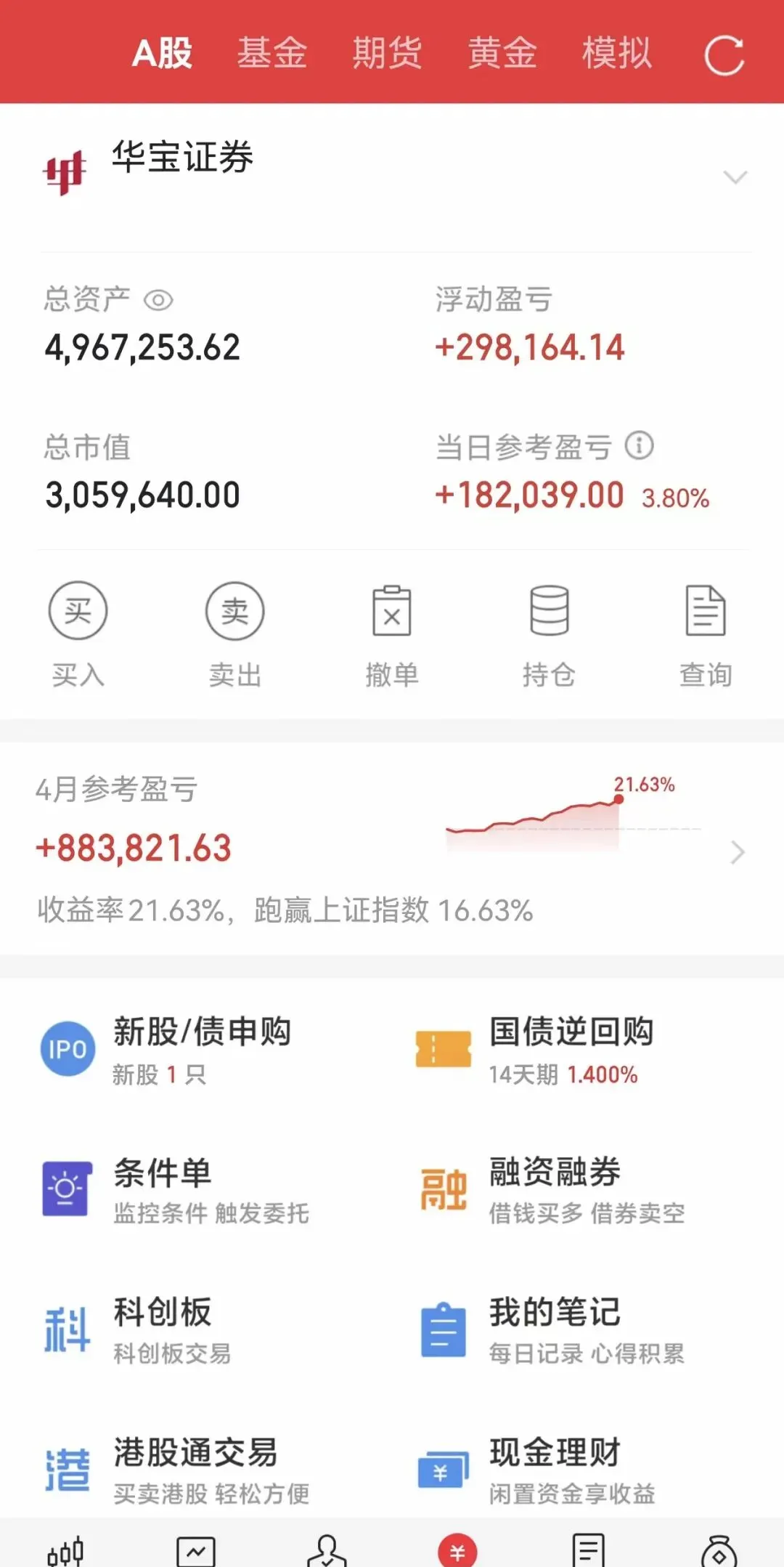 这个账户做到500(其实今天盘中已经到了)我估计节前会减仓,快Hold不住了,真正做票的人就知道,你100w的账户波动和500w的波动是不一样的