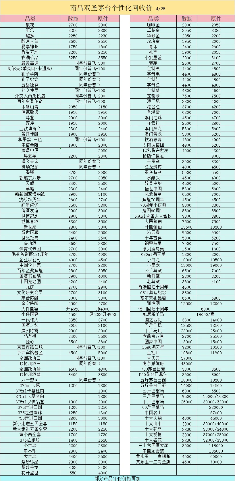 4月28日更新,茅台行情及一线回收参考价格汇总