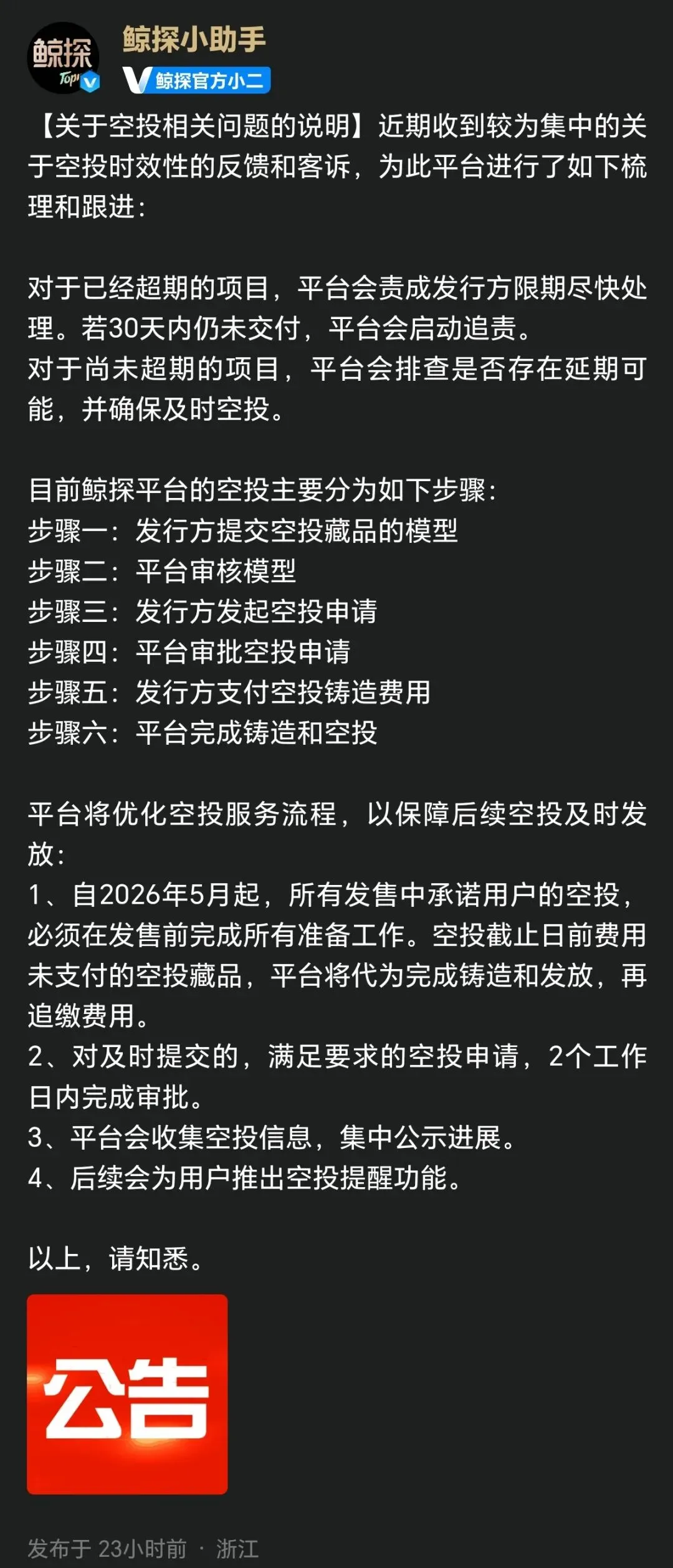 鲸探近期主要有两个新动作,一是优化空投流程,并采取先空投后追缴费用以及1个月追责的制度,显著提振了市场信心。