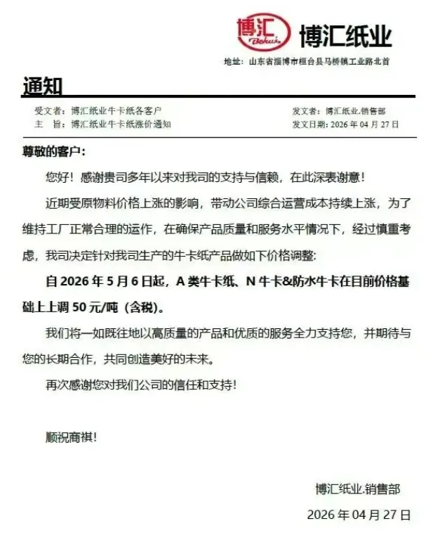 自2026年5月6日起,A类牛卡纸、N牛卡&防水牛卡在目前价格基础上上调50元/吨(含税)。
