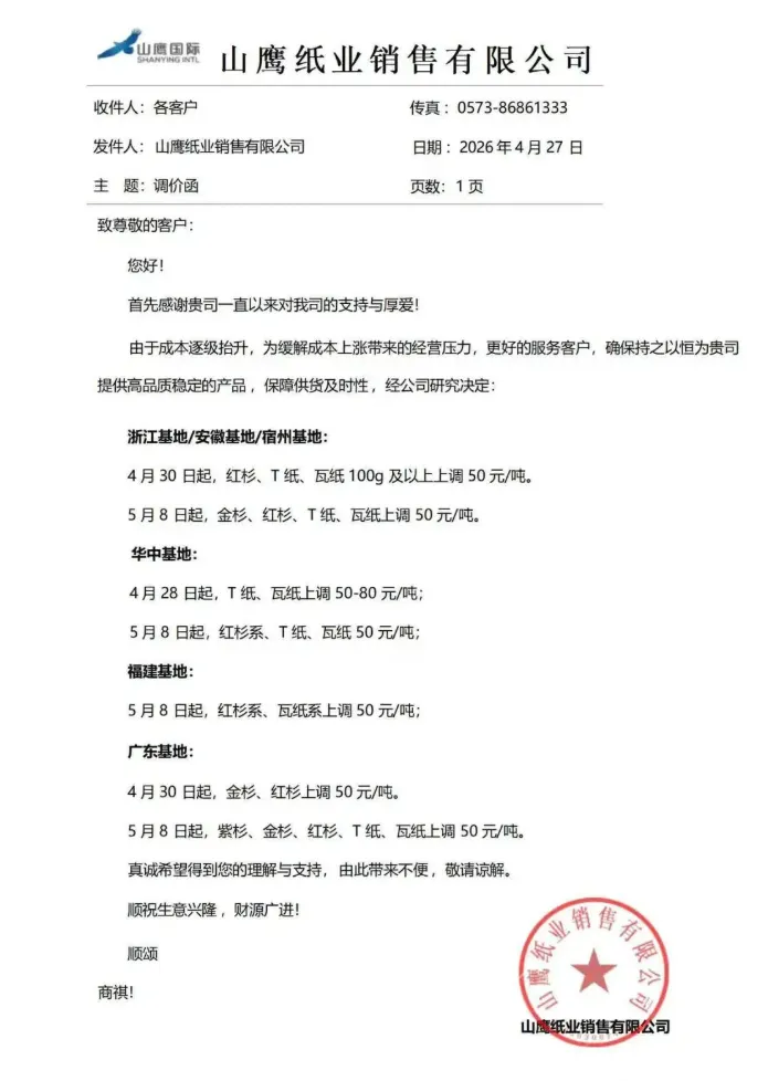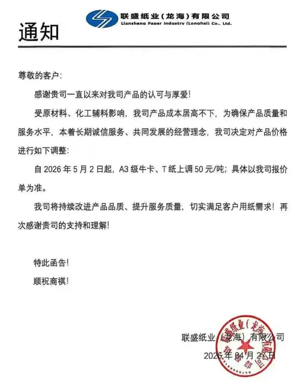 自2026年5月2日起,A3级牛卡、T纸上调50元/吨;具体以我司报价单为准。