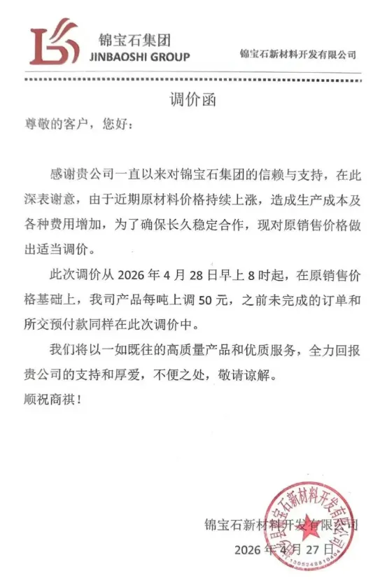 从2026年4月28日早上8时起,在原销售价格基础上,我司产品每吨上调50元,之前未完成的订单和所交预付款同样在此次调价中。