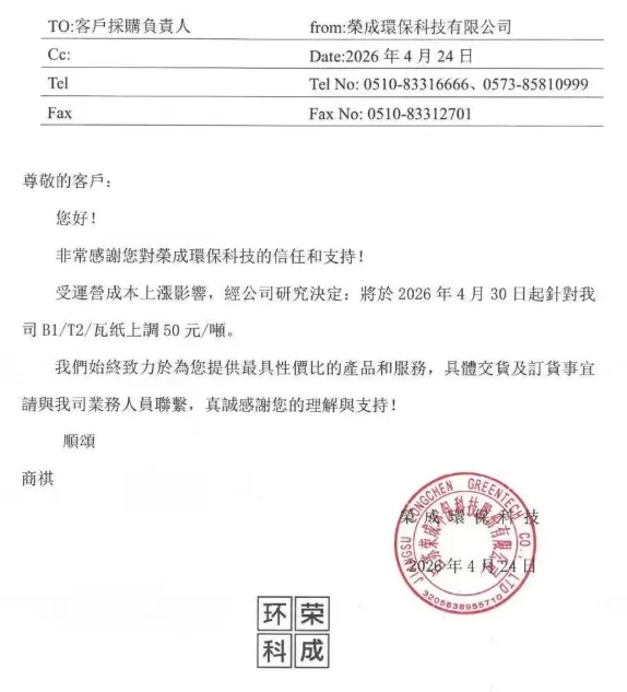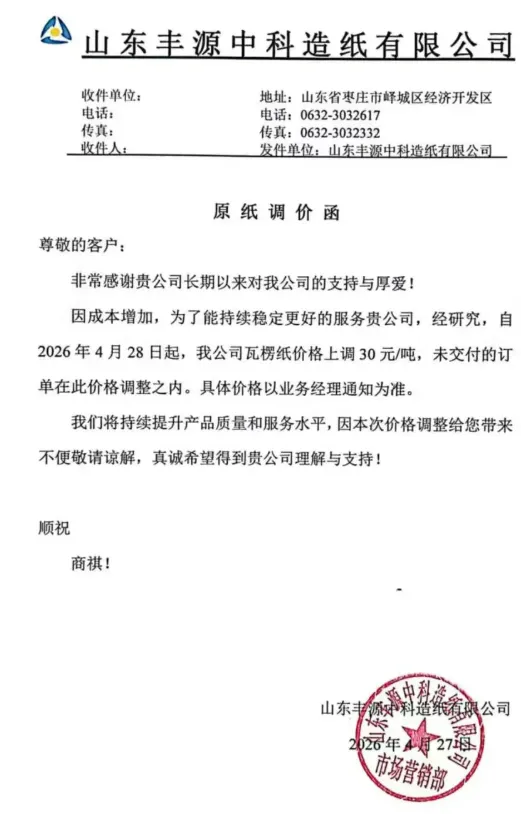 自2026年4月28日起,我公司瓦楞纸价格上调30元/吨,未交付的订单在此价格调整之内。具体价格以业务经理通知为准。