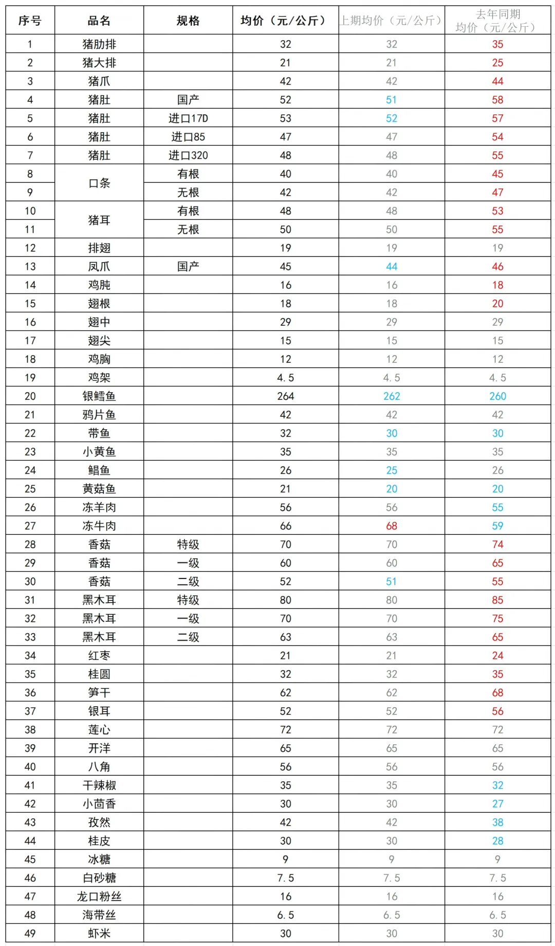 说明:表格中价格为前一周批发价(不含税,不包含配送费用),仅供参考。标红为相较本期价格上浮,标蓝为相较本期价格下降。