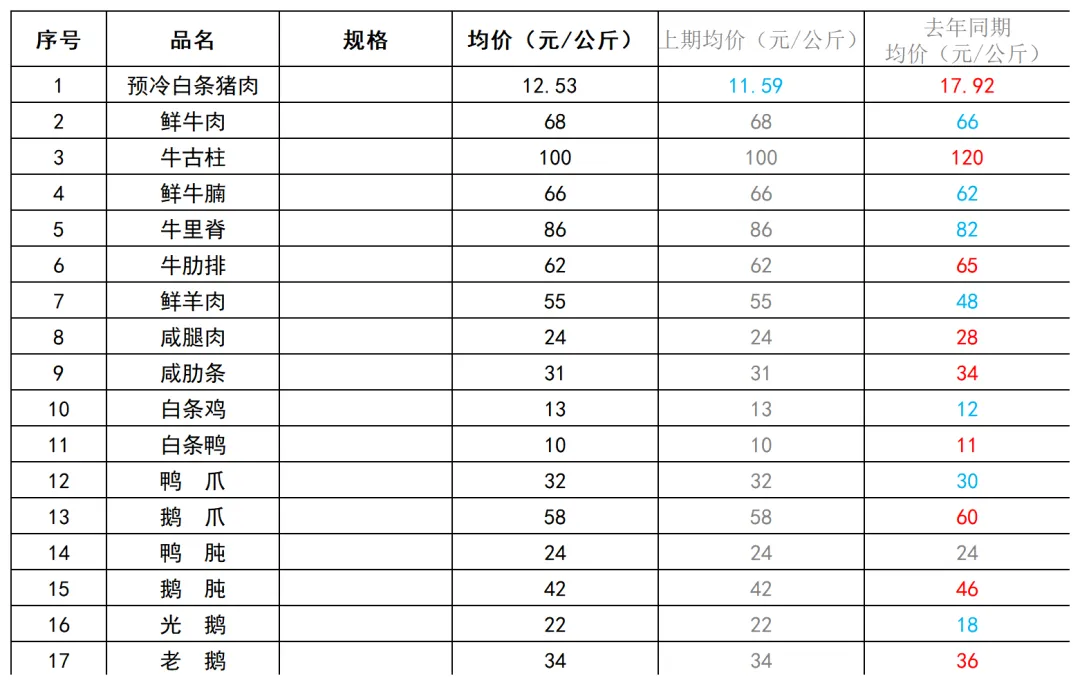 上期触底反弹后,本期猪肉价格仍保持温和回升趋势,但价格仍低于去年同期水平,性价比优势依然明显,正是家庭采买、餐饮备货的好时机。其他品类与上周基本维持不变。