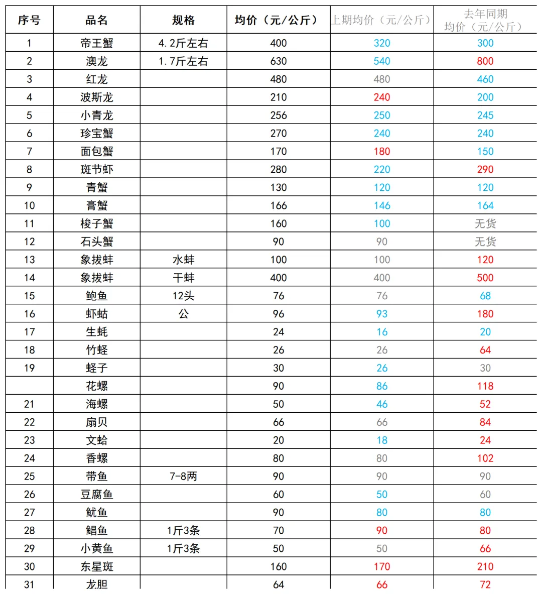 近期海鲜市场多品类价格出现上涨。梭子蟹、斑节虾方面,当前正处于休渔期尾声与开捕前期的过渡阶段,市场供应缺口放大,价格较上期有所上涨。帝王蟹、澳龙等高端进口海鲜,受近期国际物流成本及汇率波动影响,进口成本上升,价格同步上涨。与去年同期相比,虾蛄去年的高价主要源于货源紧张,今年因近期沿海养殖及捕捞集中上市,市场供应量大幅增加,价格较去年同期明显下降。其余产品在正常范围内波动。