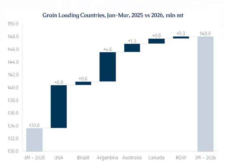 BRS在近期的一份周报中,对2026年第一季度全球海运粮食贸易做了系统梳理。报告显示,2026年1月至3月,全球海运粮食装载量同比增长10.8%,从1.336亿吨升至1.48亿吨,整体恢复力度不弱。主要出口国中,美国、阿根廷、澳大利亚、俄罗斯和法国的出口都有较明显增长,前十大出口国整体增幅达到12.2%。