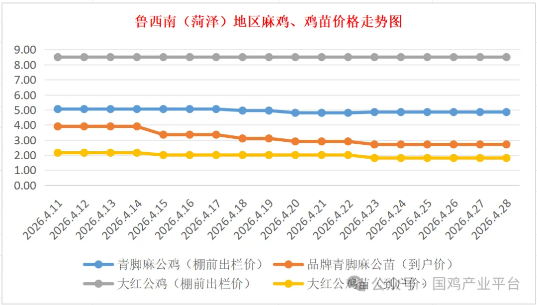 品牌青脚麻公苗(多品种快大型):价格稳定,到户价4.20元/羽,稳。