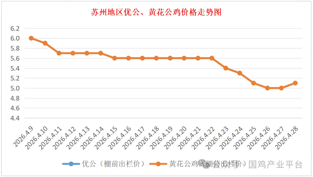 黄花公鸡:价格上涨,棚前出栏价大规格:5.10元/斤,涨(昨日5.00元/斤)。