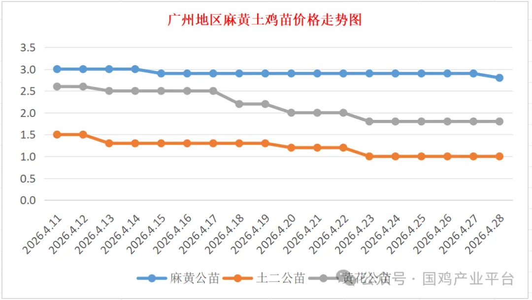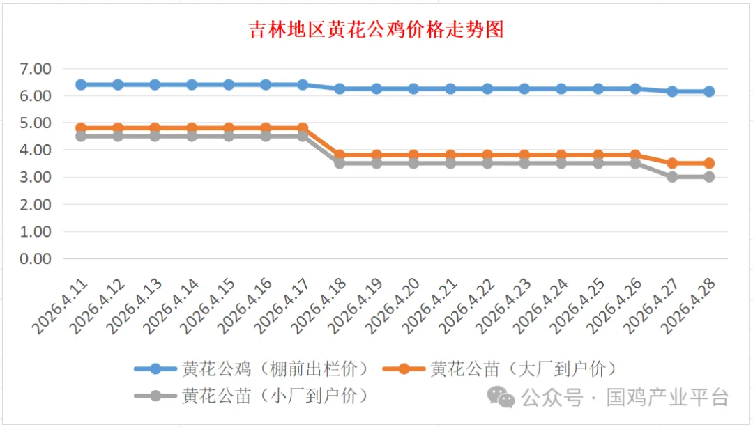 黄花公苗:价格稳定,大厂到户价3.50元/羽,小厂到户价3.00元/羽,稳。