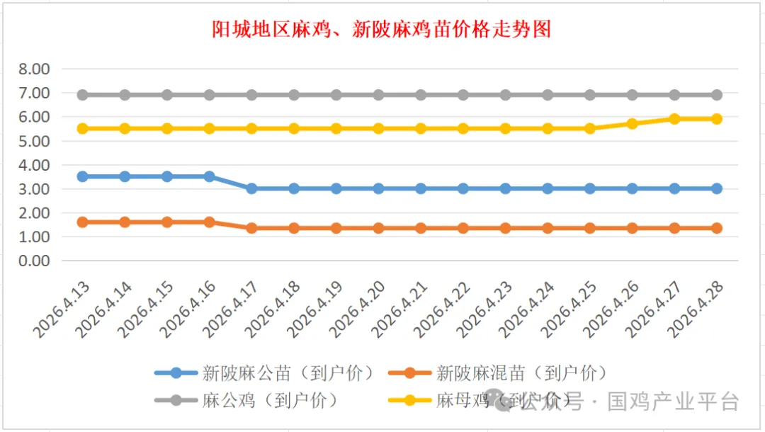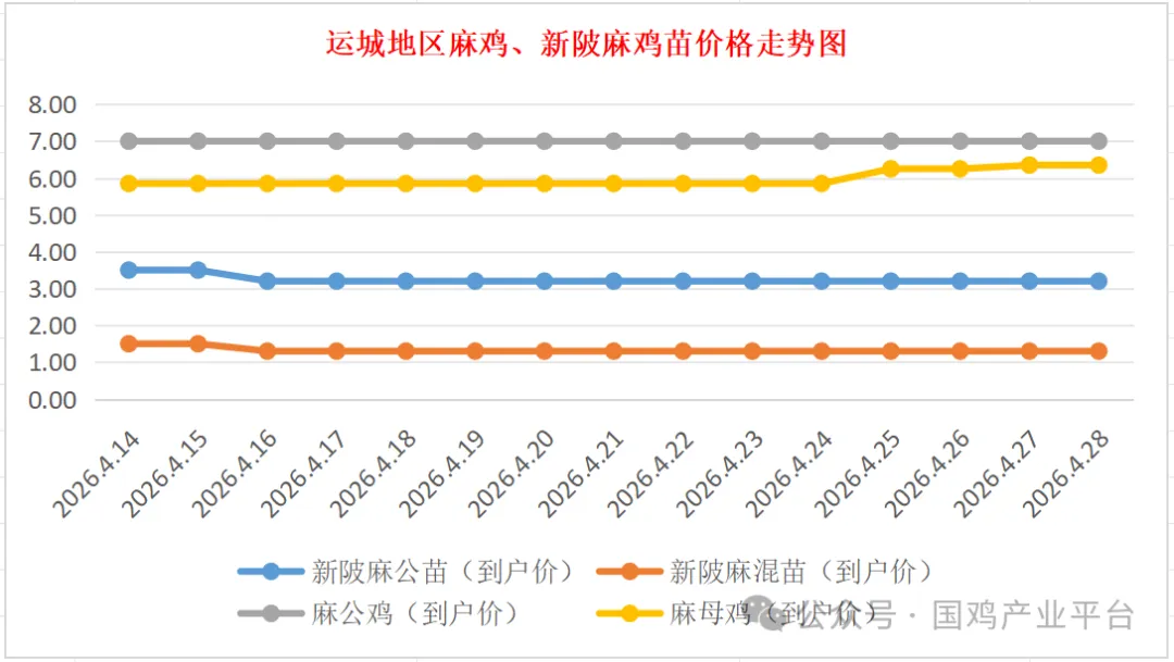 普通新陂麻:价格稳定,到户价公苗4.00元/羽,稳。