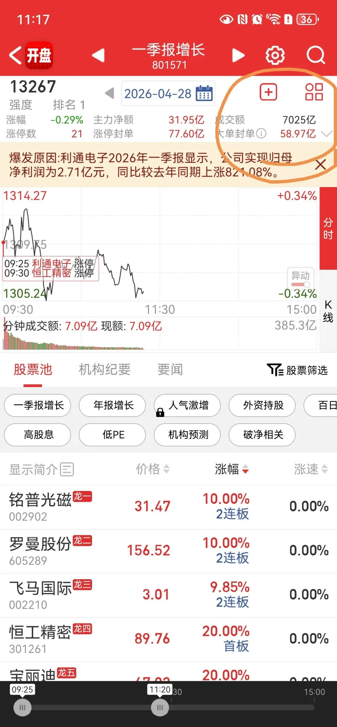 昨天选的新能源也没有发育起来,当然回踩了5日线,目前也减仓了。嗯,这种走法的话,也就是走趋势震荡向上了。那后面的话,就是等回踩吧,最少要回踩10日线。其实我比较中意的是回踩20日线,到时候我可能考虑会把仓位再全部加上来。那现在主升告一段落,可能他要等第二波才会有主升了,就不着急了,慢慢做了科技能源这个都没走完,因为这个业绩是板上钉钉的,你一季度业绩这么好。二季度业绩该好的,它还是会非常好,对吧,但是就是需要时间了,因为市场整体上是震荡向上的,而不是会猛猛地涨,因为量能跟不上,这是核心。。。。