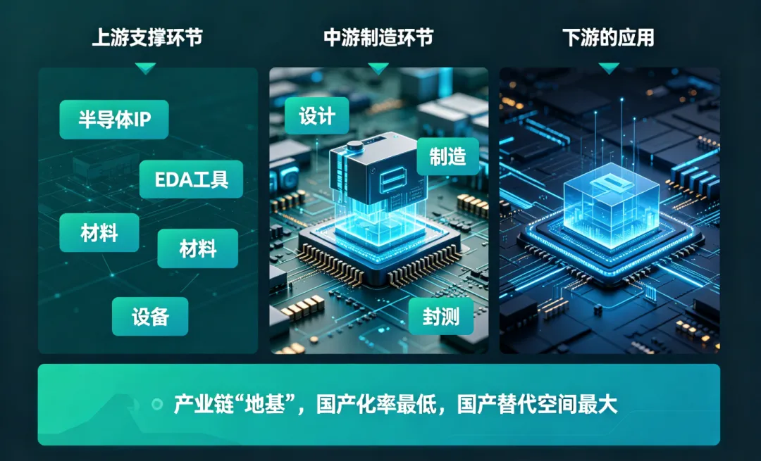 半导体产业由上游支撑环节(半导体IP、EDA工具、材料、设备)、中游制造环节(设计、制造、封测)和下游应用环节构成。上游是整个产业链的"地基",国产化率最低但国产替代空间最大。