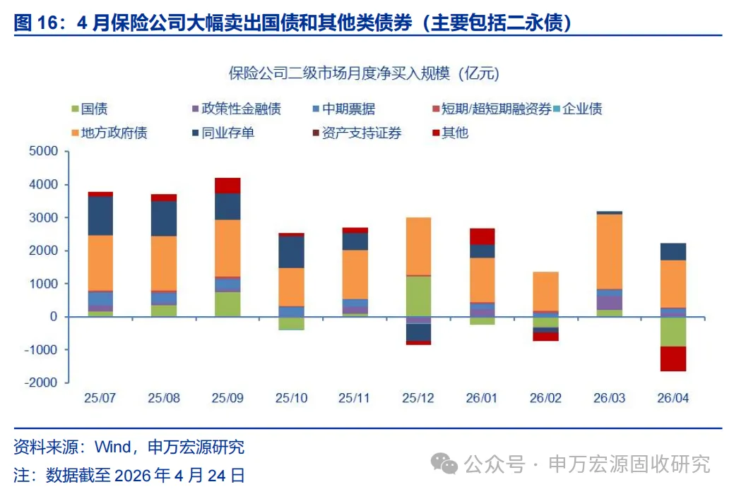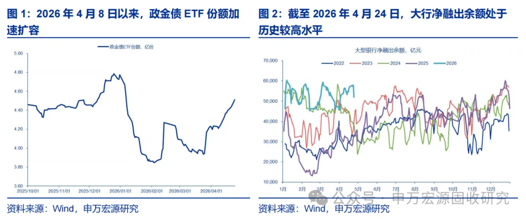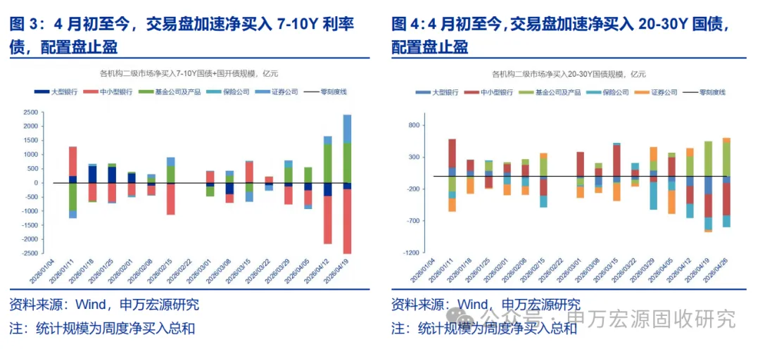 本轮债市上涨行情由“资金持续宽松和债基负债扩容”共同驱动,微观交易结构上呈现配置盘止盈、交易盘抱团取暖。截至2026年4月24日,大型银行净融出资金余额达到5.2万亿元,处于2022年以来86%分位数水平,银行融出资金规模升至历史高位、资金利率持续处于低位,资金面极度宽松。另外,虽无法通过公开数据高频获取债基申赎情况,但政金债ETF份额变动可作为高频观察的缩影,自2026年4月8日以来,政金债ETF份额加速扩张,显示当前行情已逐渐从前期配置盘主导,转向交易盘接力的阶段。二级市场交易数据亦可验证,4月初至今,大型银行和中小型银行对7-10Y国债及政金债、20-30Y国债净卖出规模加大,而以基金和券商为代表的交易盘持续加大净买入力度,并且本轮债市行情中,基金对长久期利率债的参与程度高于券商。