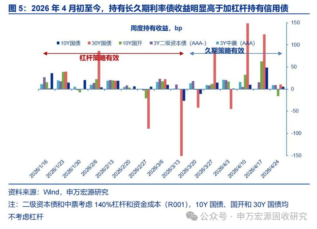 现阶段债市呈现期限轮动和品种轮动明显加快的特征,但对于投资者而言,持有长久期国债、政金债仍是最优解。前期短端利率率先受益于资金宽松,中短久期资产收益率下行较充分,随着短端和中端的性价比下降,市场进一步向长久期国债、政金债寻找资本利得空间,从实际表现看,长久期国债和政金债反而是本轮行情中表现最优的品种,2026年4月6日至4月24日(共三周),持有30Y国债收益已达到281bp,明显高于通过杠杆策略持有3Y二级资本债和中票的收益。
