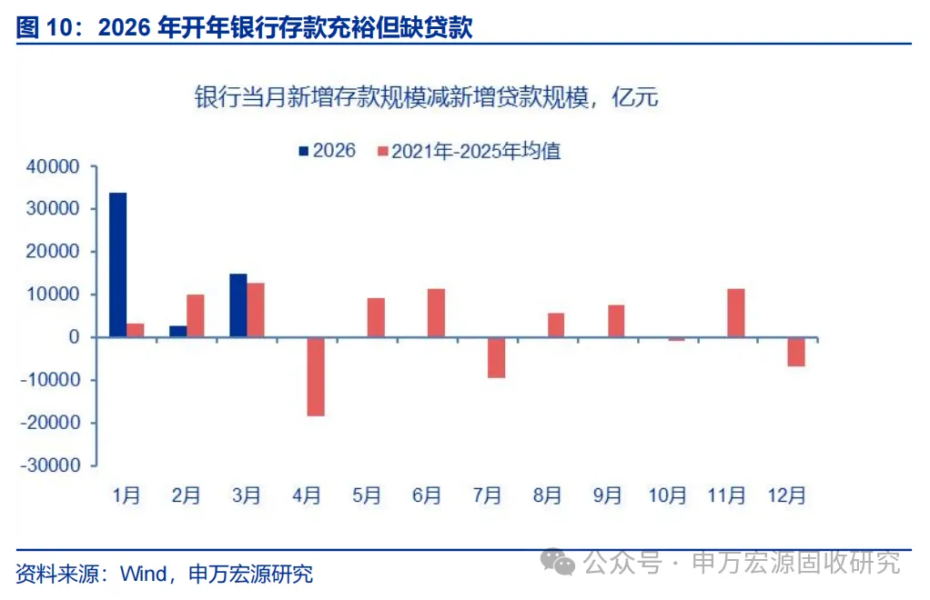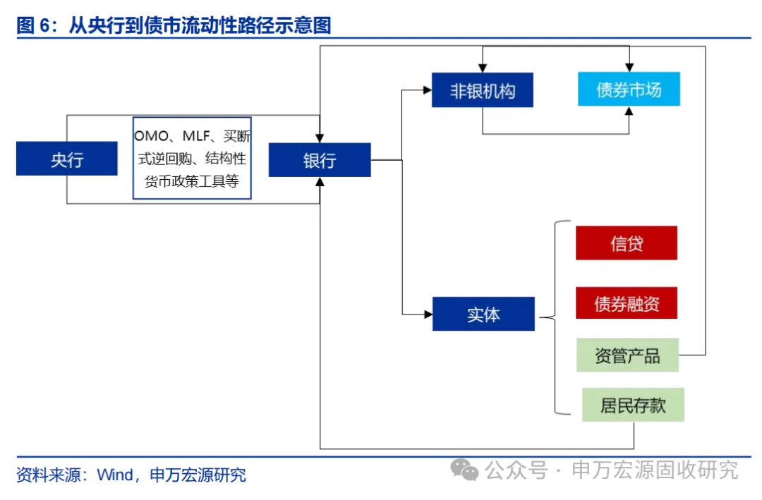 债市上涨行情能否延续,核心仍取决于流动性水位的变化。从狭义流动性看,央行是银行体系流动性的“水龙头”,央行通过7天逆回购、MLF、买断式逆回购、结构性货币政策等工具投放基础货币,主要影响银行间资金利率水平,从而向债市收益率曲线短端传导。从广义流动性看,需重点关注金融体系内部可用于配置债券的资金是否充裕。一方面,银行存款多、贷款少的格局导致其负债稳定性和资金融出能力较强,另一方面,居民存款向理财、基金等资管产品转移,非银机构负债扩容。在此背景下,如果实体信贷扩张力度相对温和,债券融资对广义流动性的消耗力度不大,则流向债券市场的资金规模可能持续维持高位。
