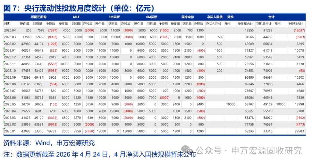 当前央行对流动性的操作已从前期的增量呵护转向适度回收冗余的流动性,但回笼并不等同于货币政策立即收紧,而是更多根据银行体系资金需求变化进行“削峰填谷”。4月24日央行公告称,将于4月27日开展4000亿元1Y MLF操作,当月MLF到期规模为6000亿元,操作落地后MLF净回笼2000亿元。结合此前“地量”OMO操作来看,前期中长期资金集中投放、信贷温和偏弱、4月政府债发行节奏未明显加快,共同推动资金利率和存单利率持续下行,并阶段性偏离政策利率中枢。在此背景下,央行通过短端OMO和中长期流动性工具净回笼进行适度纠偏,核心目标在于引导资金价格向政策利率附近回归,而非释放货币政策转向收紧的信号。