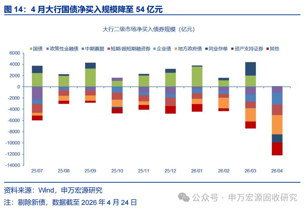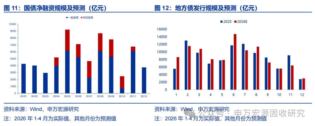 1.“水”多于“面”的局面是否会被打破,央行持续通过OMO、MLF和买断式逆回购等工具进行净回笼,且回笼规模超过市场资金冗余,可能导致银行融出规模趋势性下降,需要重点观察大型银行、中小型银行2026年以来的超额融出规模。另外,若按照去年节奏,5月政府债供给放量概率较高,需重点观察其对资金面冲击,若一级承接较好、对资金面冲击有限,则债市上涨行情仍可能延续,若政府债供给导致资金利率上行、银行融出收缩、债市出现调整,则需进一步观察中小行是否在回调后重新增配利率债。