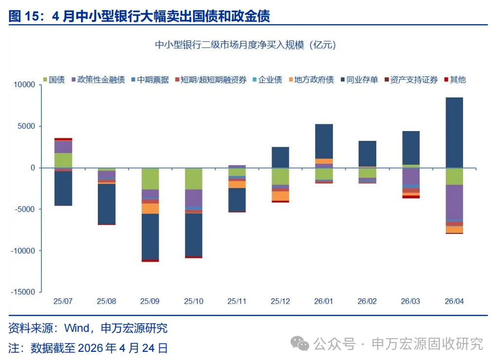 5月政府债供给放量概率较高,需重点观察其对资金面的影响。若一级承接较好、对资金面冲击有限,则债市上涨行情仍可能延续,若政府债供给等因素导致资金利率上行、银行融出收缩、债市出现调整,则需进一步观察中小行是否在回调后重新增配利率债。