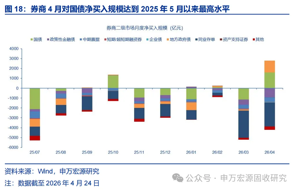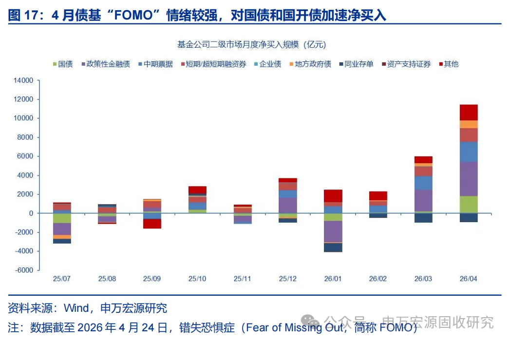 配置盘近期阶段性止盈,更多是负债成本刚性与特别国债供给腾挪共同作用的结果,配置盘止盈部分能否被交易盘承接对债市走势更为重要。对于银行配置盘而言,虽然近两年存款挂牌利率多轮下调推动负债成本下行,但计息负债成本仍具有一定刚性。截至2025年末,A股上市银行平均计息负债成本率仍为1.77%,其中国有行、股份行、城商行、农商行分别为1.56%、1.69%、1.88%和1.74%。在长端利率快速下行后,新增配置长久期利率债的票息保护和安全边际明显压缩,银行继续追涨的性价比下降。同时,特别国债发行逐步启动,配置盘也需要为后续一级承接提前腾挪空间,通过二级市场阶段性卖出部分存量利率债,释放久期、资本占用以及ΔEVE等利率风险限额,为“二级卖出、一级承接”做准备。配置盘卖出并未形成需求真空,基金、券商等交易盘在资金宽松和国债、政金债ETF负债扩张推动下形成新的承接力量,足以阶段性消化配置盘止盈带来的卖压,使行情从前期配置盘主导逐步转向交易盘接力。一方面,基金端存在较强的“FOMO”交易特征,但其背后同时受主观追涨和负债端扩张共同推动。另一方面,券商对国债的参与程度也明显抬升,4月券商国债净买入规模达到2025年5月以来最高水平,显示自营及交易盘在资金宽松环境下同样加大了对利率债的配置和交易力度。综合来看,债市行情转向“配置盘止盈、交易盘承接”的结构,银行等配置盘因负债成本刚性和特别国债供给腾挪而阶段性卖出,基金和券商则在负债流入与宽松资金支撑下承接卖压,推动债市上涨行情延续。