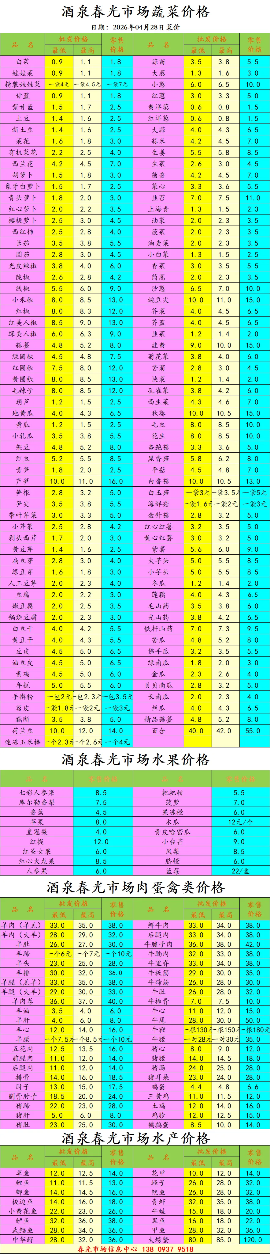 【今日菜价】甘肃酒泉春光市场价格行情202 6年4月28日