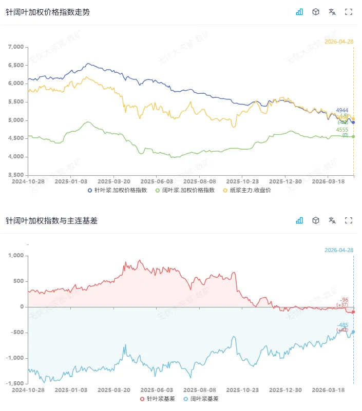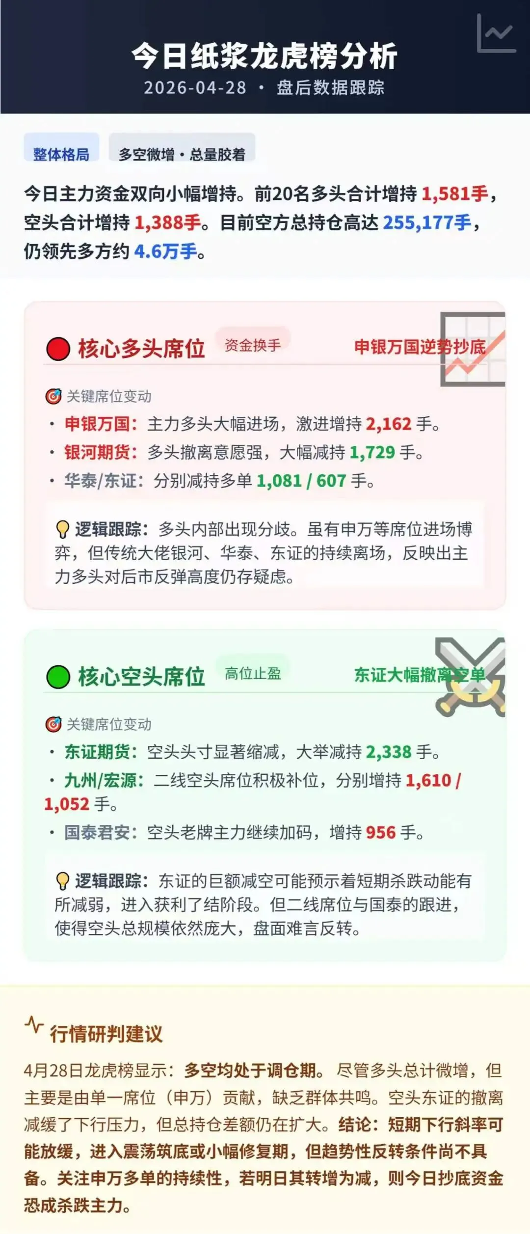 市场摘要:今日纸浆SP05合约区间震荡,针叶青岛银星基差07+0附近,常熟银星基差07+60附近,刚需点价成交为主。阔叶浆报价维持4580附近,节前多观望。期货端今日主力资金双向小幅增持。前20名多头合计增持 1,581手,空头合计增持 1,388手。目前空方总持仓高达 255,177手,仍领先多方约 4.6万手。
