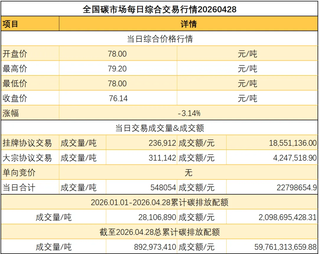 >【CEA】全国碳市场每日综合价格行情及成交信息20260428