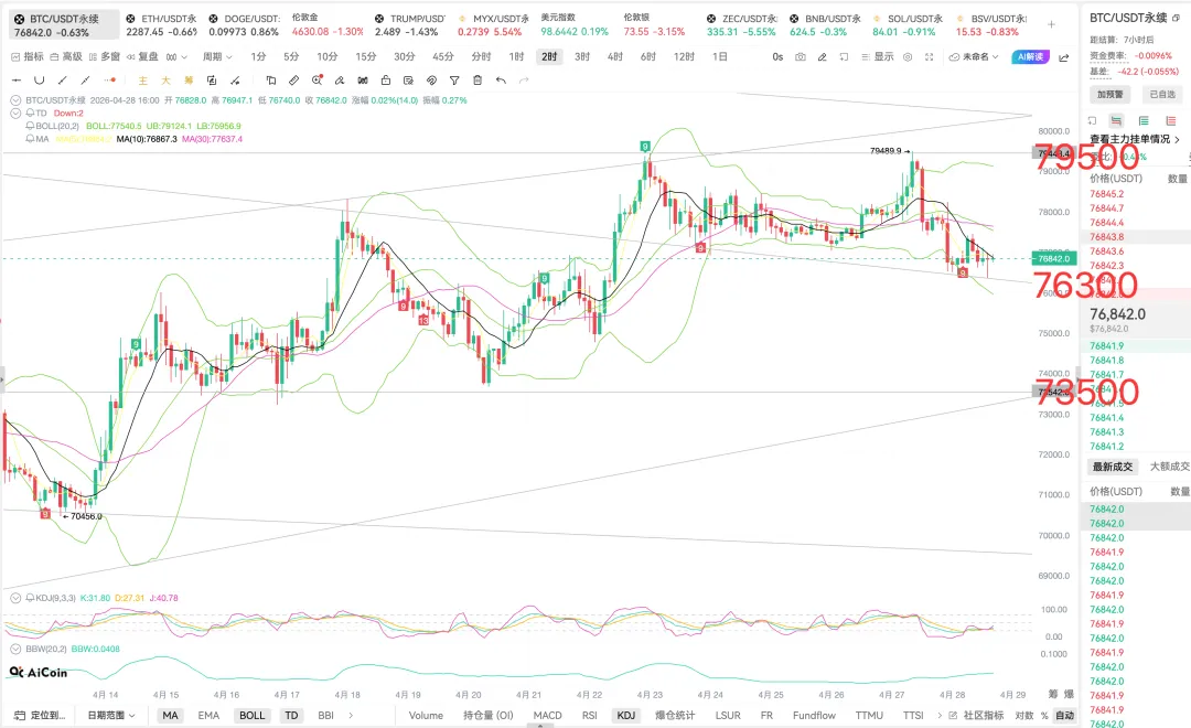 技术面12小时插针上探之后,目前连收3阴,下破中轨处于中下轨区间运行,日内操作大趋势继续看空,布林带开口一旦打开,预计BTC将会进一步下跌,目标首先关注下轨74500附近。4小时目前连收2阴,布林带开口,上方关注中轨和MA30在77800附近交叉形成的压制,反弹附近可先空一次,晚间布林带开口如果继续打开,BTC沿下轨还会下跌。短期1小时BTC插针下探76300附近支撑,如昨日凌晨一致,收取较长下引线阳柱,短线看涨,美盘开盘之前大家可以看一波反弹修复行情空间,但利润不看太大,操作上继续以反弹高位再空为主。另外日线MACD:高位死叉,绿柱初现,短期回调压力增加。4小时MACD:死叉下行,空头动能占优。综上,BTC日内操作以反弹高位做空为主。