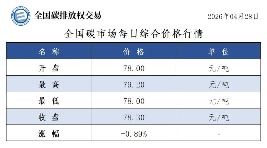2026年1月1日至4月28日,全国碳市场碳排放配额成交量28,106,890吨,成交额2,098,695,428.31元。