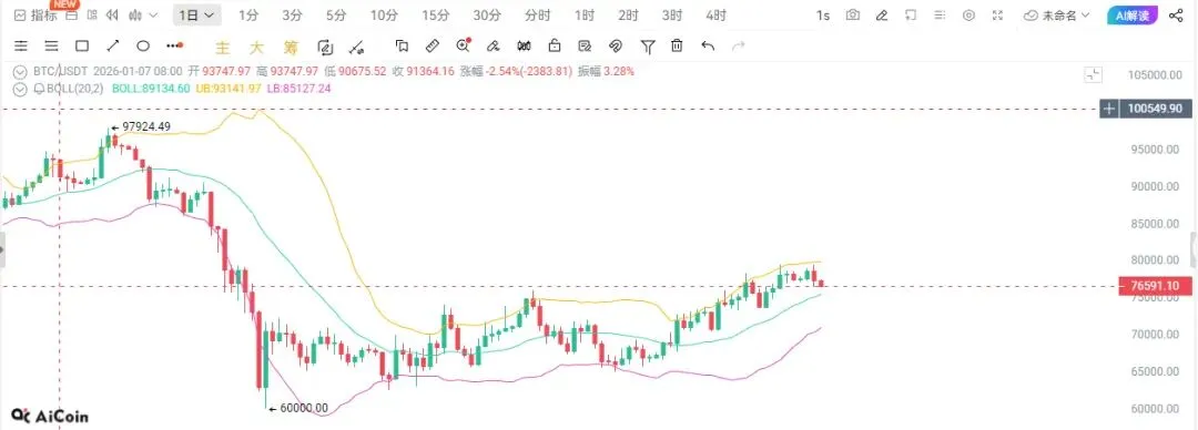 从比特币日线级别走势来看,当前盘面收出阴线K线,价格企稳于77300价位附近运行,整体市场处于高位区间震荡整理格局,多空双方博弈趋于均衡,短期并未出现明确的单边趋势指引,盘面核心压力区间集中在77500-79500区域,该区间汇集了前期高点承压位与短期筹码密集成交区,多头若想实现趋势性上行,必须有效突破该压力带才能打开进一步上涨空间,而下方核心支撑位定格在7600关口,此位置既是近期震荡区间的下沿支撑,也是多头资金的关键防守线,一旦跌破将引发短期空头动能进一步释放;从布林带指标来看,当前布林带呈现明显缩口且轨道走平的运行态势,同时短期各周期均线呈现平行排列走势,这一信号充分表明市场短期波动率持续收窄,多空力量进入僵持阶段,行情正处于变盘前的蓄力整理期,后续需紧盯布林带开口方向与价格轨道突破情况以确认趋势走向;再看MACD指标,快慢双线呈现向下粘合的运行态势,同步对应的量能柱持续处于缩量状态,说明前期多头上涨动能已逐步衰竭,空头打压力度温和释放,多空动能转换进入关键窗口期,暂无明确的单边量能支撑行情走强;KDJ指标方面,三线形成死叉后持续向下发散延伸,当前指标数值逼近50中轴区域,需重点关注50数值附近的指标支撑有效性,若此处指标拐头有望带动价格小幅修复,若持续下破则会进一步加剧短期调整节奏;VR成交量比率指标维持在190数值附近窄幅盘整,反映出市场整体成交量能保持平稳,资金参与度未有明显异动,多空资金均保持观望态度,暂无大规模进场布局动作;值得关注的是,当前价格始终稳健运行在MA120中长期均线上方,意味着盘面中期多头趋势格局依旧完好,中长期多头逻辑未被破坏,仅短期受制于79500一线强压力位的持续压制,多头多次向上试探均未能实现有效突破,在未完成对该关键压力位的实质性站稳突破之前,短期多头难以聚集足够的上攻动能,行情大概率延续高位窄幅震荡走势,很难走出具备持续性与力度的强势反弹行情。