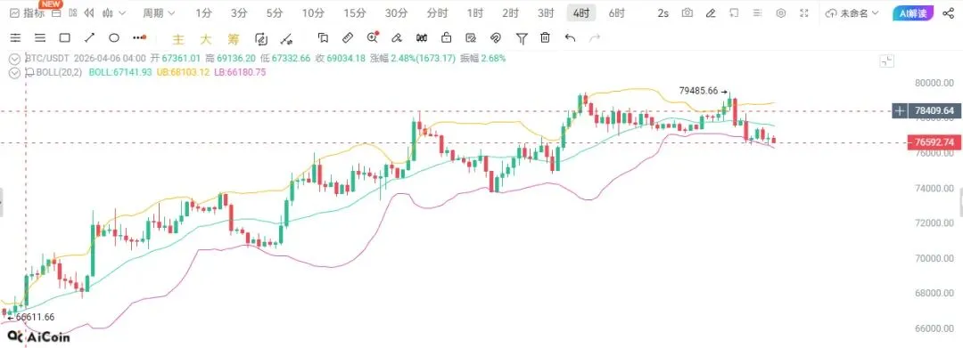 比特币四小时周期盘面中,行情完成二次探顶触及79500关键阻力区域后承压回落,价格阶段性回调至76500短期支撑关口,现阶段下行潜在目标看向75000核心防守区位,该支撑位置若能稳固守住,行情大概率再度重启上行试探高位压力。四小时技术结构层面,价格上行节奏受六十周期均线明显压制,当前币价依托布林带下轨上方区间运行,布林带整体呈开口下行形态,短期周期均线形成死叉排列并持续拐头下行;MACD指标双线击穿零轴后持续向下延伸,空头量能柱同步持续放量增长,市场短期空头情绪逐步升温,KDJ指标低位小幅止跌拐头,需密切留意指标低位临界区间的支撑修复力度;VR量能指标长期徘徊于70数值区间横向整理,市场交投情绪平淡,多空资金暂无集中进场动作。综合盘面整体结构分析,日内价格连续回落,短期走势明显偏弱,但整体多头大结构并未遭到破坏,关键支撑区间未有效失守前,依旧维持震荡上行的核心思路。短期行情上方首要阻力锁定79000一线,下方第一支撑坐落76000位置,一旦该支撑位被空头有效击穿,行情将进一步下探75000重要分水岭,此点位也是判断行情是否彻底扭转趋势、转入空头节奏的核心分界,只要该关键支撑区间完好稳固,中期多头运行逻辑便不会发生改变。
