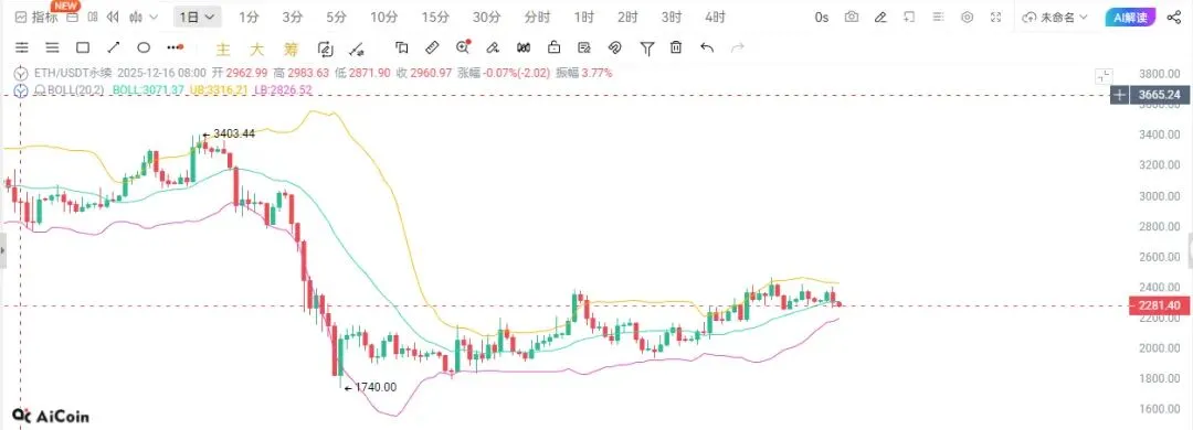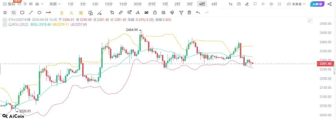 以太坊日线级别今日收报中阴K线,价格在2300关口附近震荡企稳,整体呈现高位滞涨后弱势回落态势,反弹力度显著滞后于比特币,属于典型的被动跟涨格局,缺乏独立上行动能。技术结构上,价格承压于2350-2400区间强阻力带,该区域汇聚短期筹码密集峰与前期反弹高点,多头多次试探均未能有效突破,上方套牢盘压制明显;下方核心支撑位于2250-2200区间,此处是近期震荡平台下沿与多头关键防守线,一旦失守将打开进一步回调空间。均线系统方面,短期MA7/14形成死叉拐头向下,对价格形成持续压制,MA30暂时走平提供弱支撑,而MA90/180仍维持下行排列,中期空头趋势框架未被根本扭转,当前反弹仅视作超跌修复而非趋势反转。布林带整体呈缩口走平形态,价格运行于中轨下方,轨道收敛预示市场波动率收窄,多空博弈进入僵持阶段,等待方向性突破选择。MACD指标双线在零轴上方死叉后向下发散,空头量能柱持续扩张,反映多头动能快速衰减、空头力量逐步主导短期节奏。KDJ指标自高位回落进入中轴下方区域,当前处于低位钝化边缘,短期存在小幅修复需求但反弹空间受限。