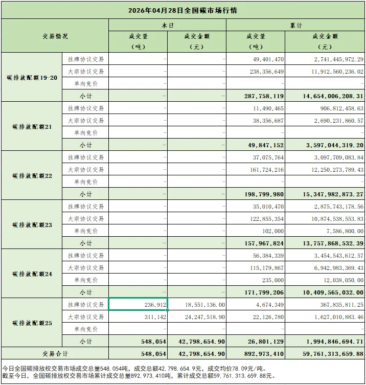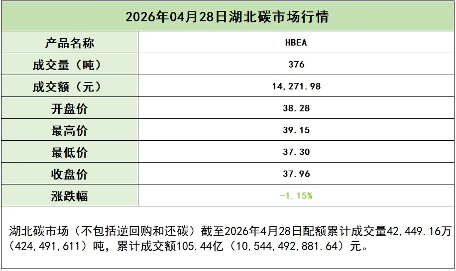 当前位置:首页>行情>【碳市场行情】2026年4月28日湖北及全国交易数据