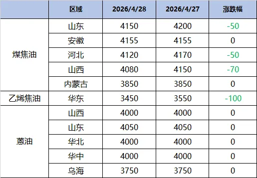 高温煤焦油小幅下行,跌幅在50-70元/吨。但乙烯焦油下跌150元至3450元。