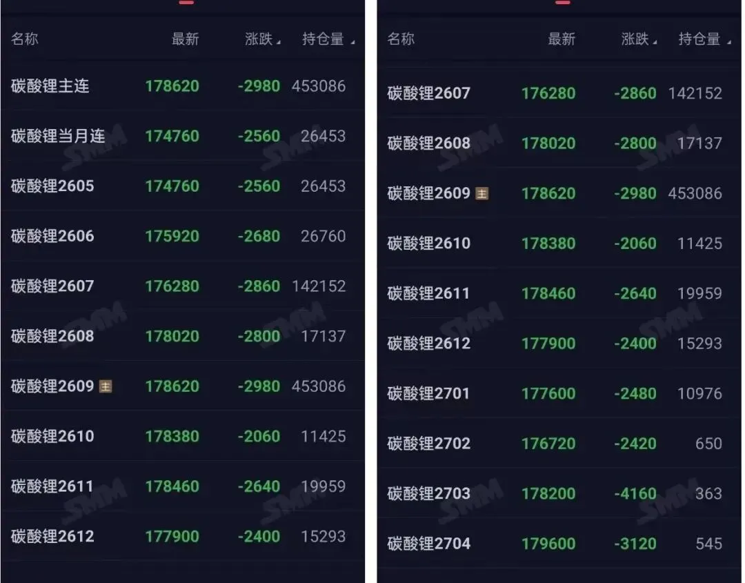 广期所碳酸锂主力合约2609,最新报价178620元/吨,单日暴跌2980元;