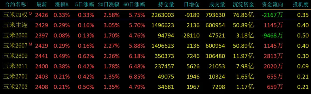 玉米2607:期权剩余49天,期货剩2个月2天,持仓149万手,去年同期147万手,(最高持仓151万手,4月21