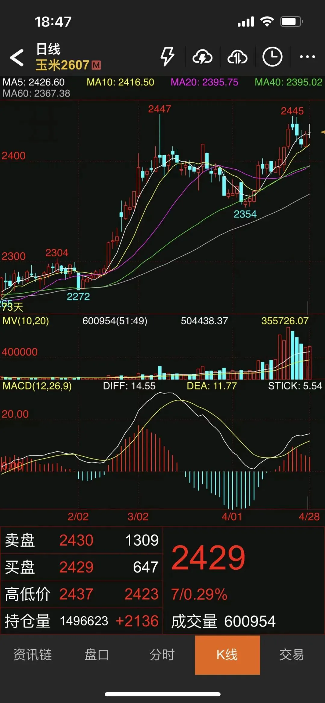开盘2415,最高2430,最低2415