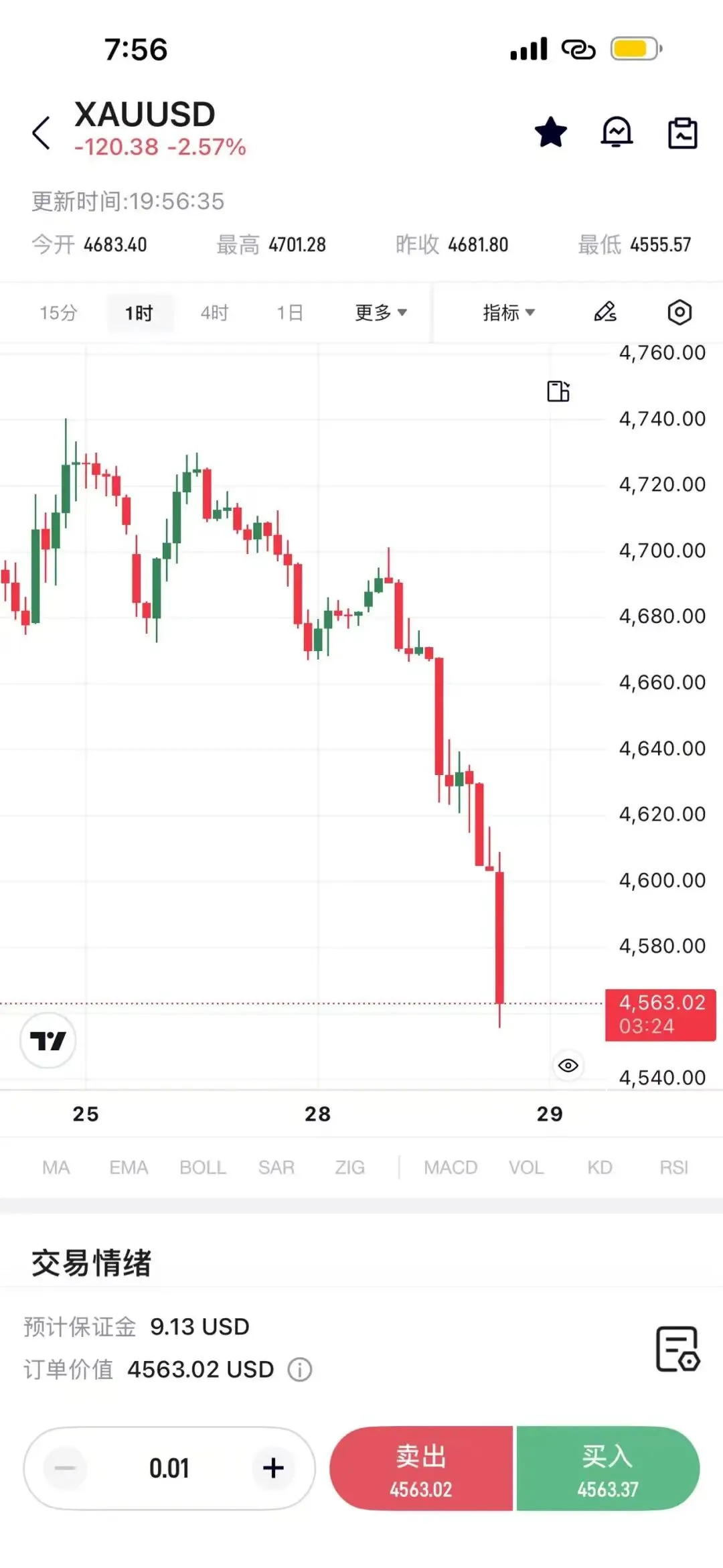 今天黄金再次出现明显跳水,一度跌到4566美元附近(约998/克),目前仍在持续下跌。