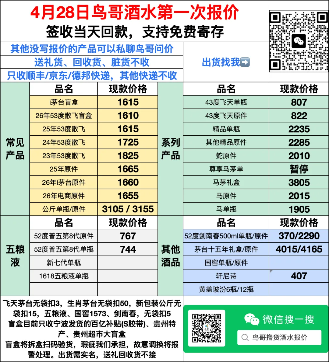 当前位置:首页>行情>4月28日茅台五粮液每日最新行情-收货结算价(5月1日放假一天)