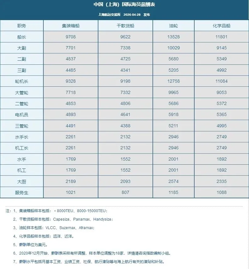 上海航运交易所还发布了中国国际海员薪酬表,显示了不同类型船舶上不同职位海员的薪资。薪资以美元计价,并基于18家公司的样本。表格显示,其中,船长在油轮上的薪酬最高,为13528美元;服务生在干散货船上的薪酬最低,为807美元。