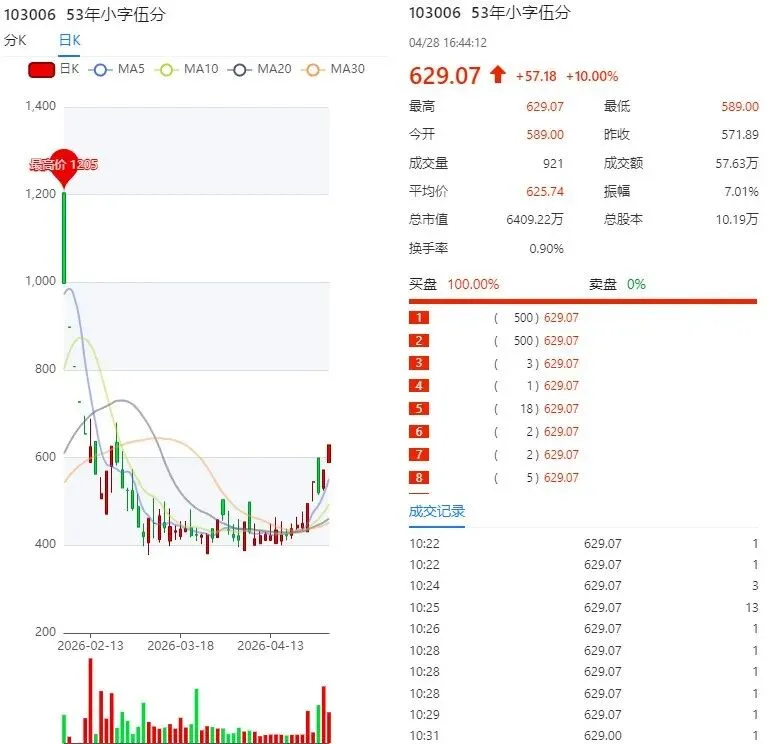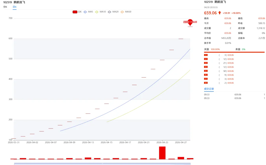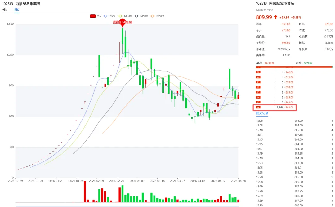 今日成交额7122万,成交量221万,上涨92家,涨停36家,下跌107家,跌停21家,平盘4家,和上个交易日对比,成交额下降658万,上涨占比45%,涨停占比17%,整体行情涨跌互现。双凤擎天:昨日强势涨停,今日大幅高开,盘中两轮洗盘充分消化浮筹。午后快速下杀后直线秒封涨停,封单稳固、筹码高度锁定。成功突破中期新高,上行空间彻底打开,主力洗盘蓄力意图明确,资金合力共振,后续有望开启一字加速行情。53 年小字伍分:行情加速走强,主力封单强劲坚决。作为经典老票,盘中洗盘换手充分,筹码沉淀良好。板块辨识度持续拔高,有望突围领涨,成为行情核心龙头,持续重点关注!鹮鹤双飞:涨停打板,依旧缩量涨停,目前比较强势,有机会突破800+,可以积极介入,持仓待涨。内蒙古纪念套装:每日 + 10 元底部托单模式,今日运行第九日,今日保底托底价 690 元。盘中 693 元大单强势承接护盘,托底支撑力度十足,盘面利好信号明确,走势稳健向好。总结:今日钱库商城行情分化加剧,整体涨跌互现。多数弱势品类延续震荡调整,而优质龙头标的逆势走强,不断突破阶段新高。大盘整体氛围偏弱,弱势环境下,主力洗盘节奏加快、快速完成筹码高度控盘。操作上优选强势标的博取短线收益,同时逢低布局低位调整品种,耐心等待右侧行情回暖,择机顺势加仓。风险提示:以上皆为笔者个人观点,钱币行业波动剧烈,入市需谨慎。
