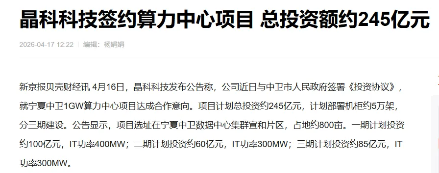 算电协同:公司近日与中卫市人民政府签署《投资协议》,就宁夏中卫1GW算力中心项目达成合作意向。项目计划总投资约245亿元,计划部署机柜约5万架,分三期建设。公司主营业务为新能源电站投资运营,已与腾讯、阿里等头部互联网企业合作打造数据中心微电网等低碳能源解决方案,并积极布局和组织申报绿电直连项目。公司将依托自身在新能源发电优势,项目建成后直接绿电直连。
