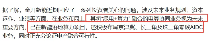 算电协同::公司积极布局“电算协同”,除哈密首批次2000P智算项目之外,公司积极布局京津翼,长三角以及珠三角零碳AIDC业务,致力于提供高质绿色算力。