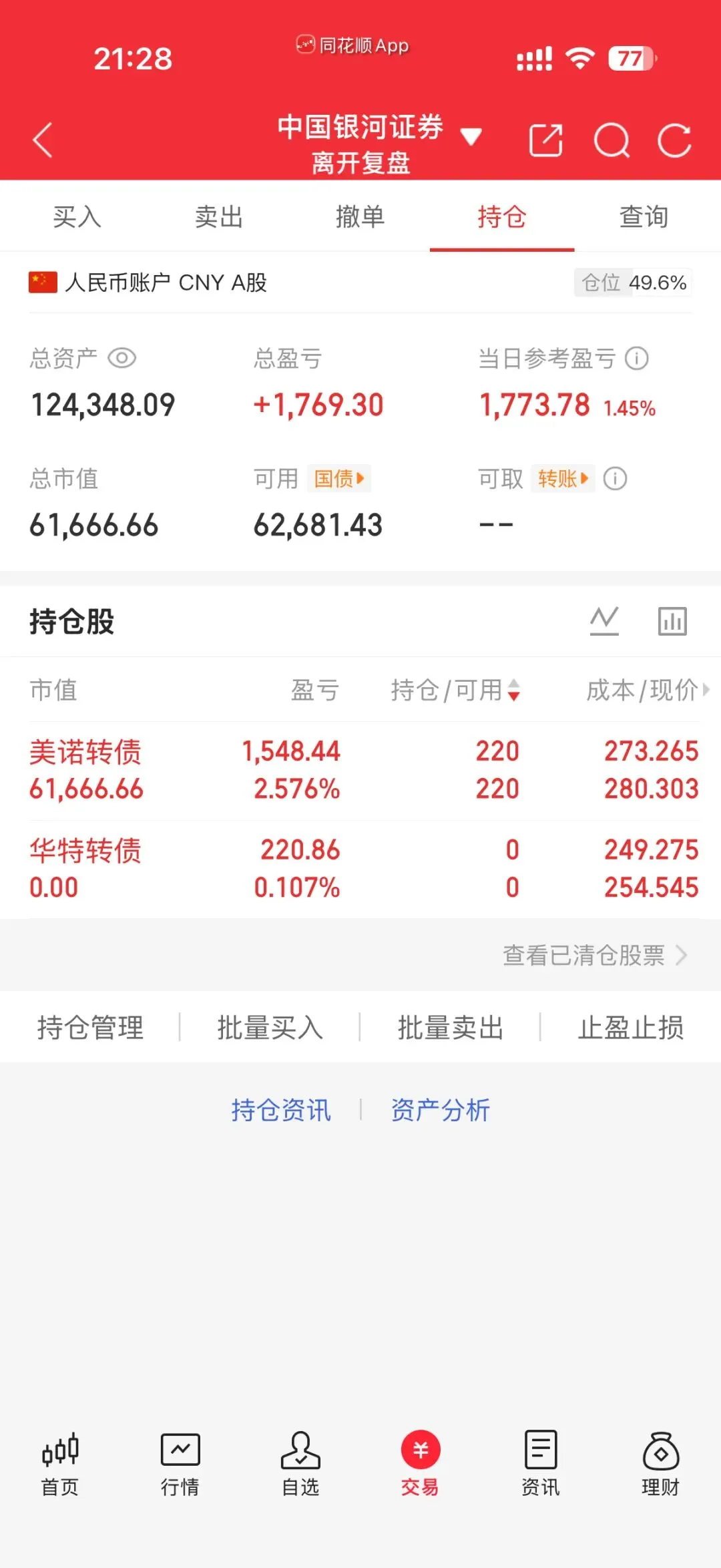 因为看不清叠加业绩预告,上周五新易盛低于预期踩雷后就很谨慎,昨天空仓,今天玩了下转债,对我来说转债还是有点难度,玩不太明白,只是这两债比较强势,没亏钱。尾盘本来是想买正股的,因为美诺华这个趋势太强了,但是看到转债有溢价就想买债然后去转股,但是第一次玩,不太熟悉操作,没来得及转。然后研究了下,这债明天是最后一天了,以后就没这债了,可能要批量兑现吧,感觉不如正股。明天可以适当地开点仓位做节前博弈了,祝好!