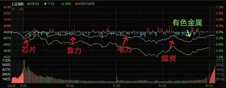 今日沪深两市成交2.54万亿,成交量较上一交易日缩量531亿。两市实际上涨1661家,实际下跌3409家,实际涨停58家,实际跌停29家。主流资金今日净卖出804.26亿元,下图是今日资金进攻的板块路径今日市场全天呈现低开低走行情,创业板指、深成指、科创50指数均跌超1%,其中创业板指录得日线4连阴,并已经跌破10日均线。随着临近五一长假,市场假期效应和业绩风险释放形成共振,个股方面今日仍有60余股跌超10%。而成交额前20个股中,也仅有三成飘红,趋势抱团遭遇削弱成为近期指数遭遇调整主因,也倒逼部分资金向绿电、工业气体以及部分纯情绪博弈方向转移。明日作为五一节前的最后出金日,沪指能否继续站稳60日均线上方仍是关键。当前沪指日线MACD仍处于高位钝化且KDJ尚未出现拐头向上重新金叉信号,后续仍将作出方向性选择,因此短线仍应以多看少动为宜。上证日线走势结构:今天是在这个顶分之后的横盘震荡,也就是说还是这一笔的延续中。从这个结构看的话,比前面4197点这次顶形成的力度,实际上是偏弱的。前面实际上破坏性很强,而目前这个位置,四天没有破坏前面的三根K线的范畴,也就是说还算强。明天不能向下力度太大。
