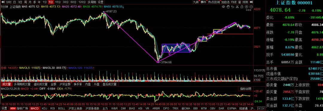 也就是说调整的越浅,下跌越无力,那越有利于未来的反包。但是我们需要防止的是如果这个位置明天继续下杀,形成1分钟的趋势下跌,甚至这个下跌空间明天加大,就是一种不利情况的发生。明天我们看最终走出的是什么情况。目前上证4020点不跌破,其实是中线机会。依然是整理完了之后找5分钟的买点。
