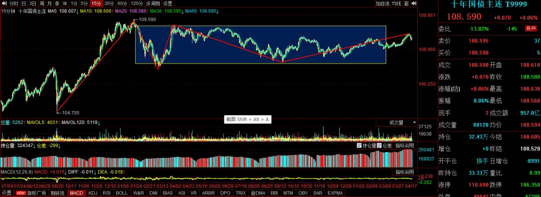 上图是十年期国债期货的15分钟K线走势图,目前是15分钟上涨笔,目前股债的策略应该是债横盘,股票市场趋势向上。
